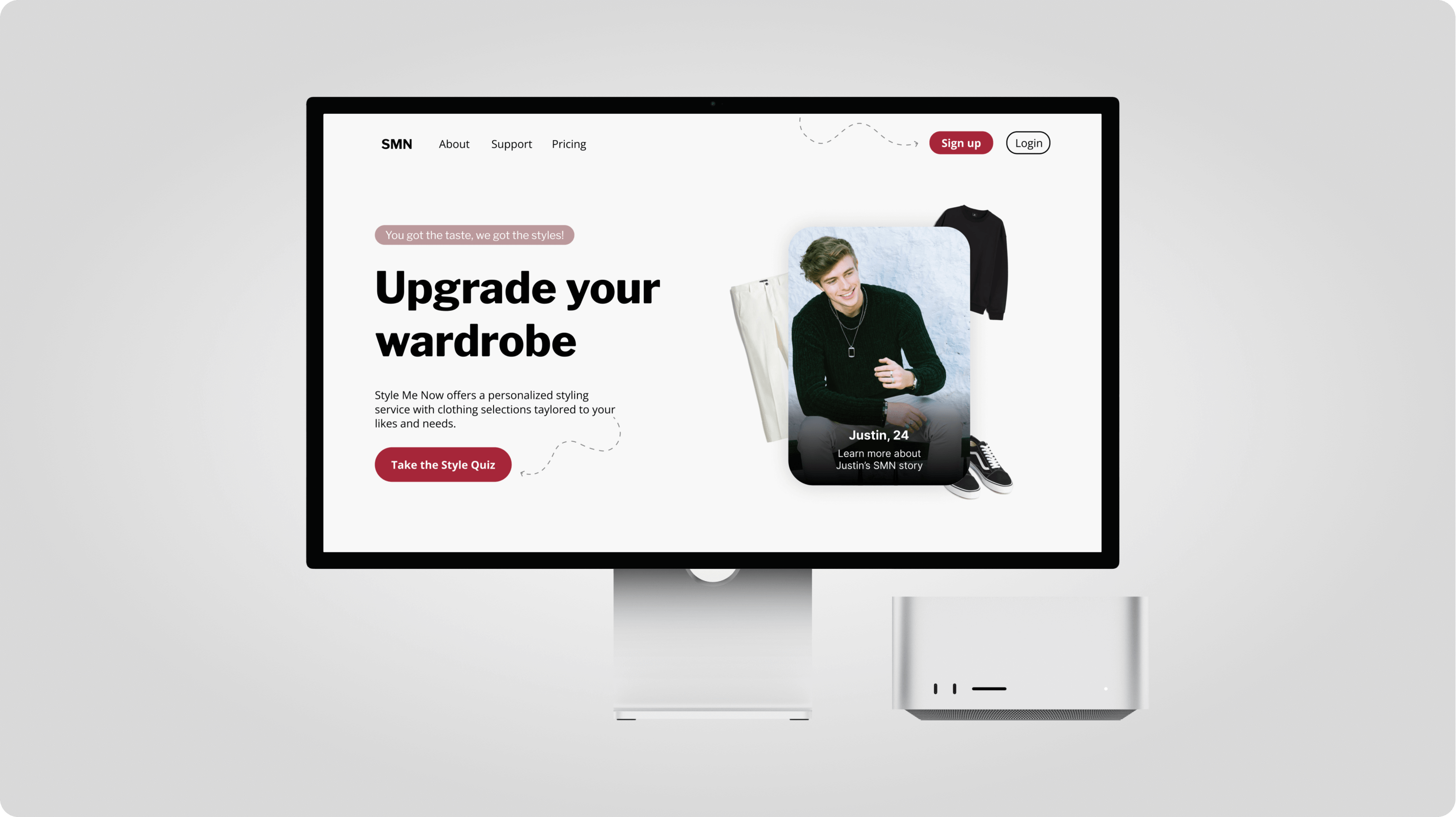Dieses neue Konzept ermöglicht es Nutzern, direkt auf das Bild zu klicken und so anhand eines zufriedenen Kunden mehr darüber zu lernen, was Style Me Now für sie tun kann. Gleichzeitig wird durch die neue Grafik ein direkter Bezug zum Service geschaffen, indem die einzelnen Kleidungsstücke dargestellt werden, die Justins Outfit bilden (oder zumindest ähnliche Pieces, die ich online finden konnte).
