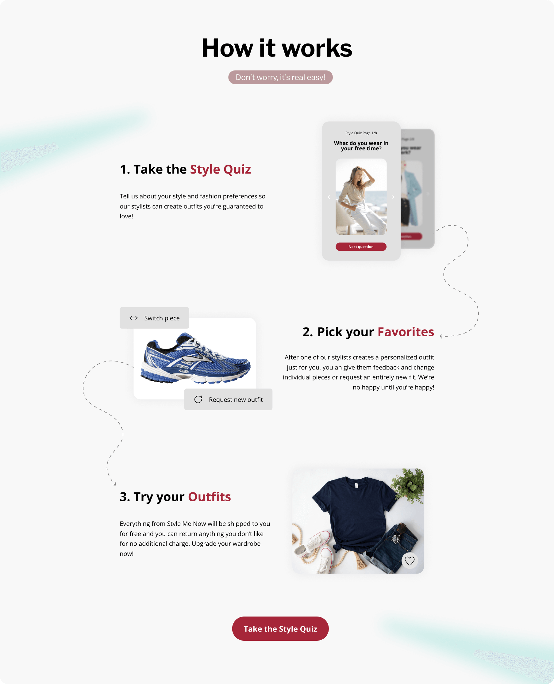 Hier versuchte ich, so kurz wie möglich und so lang wie nötig zu erklären, wie der Service genau funktionierte, um potenzielle Kunden zu überzeugen. Unten findet sich wieder ein CTA-Button für das Style Quiz, falls entsprechendes Interesse geweckt wurde.